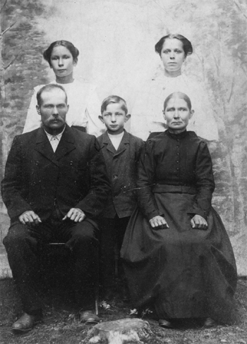 Tuomas Henttonen perheineen. Kuva otettu ilmeisesti 1900-luvun alkupuolella. Istumassa Tuomas (Matinpoika) Henttonen (s. 20.5.1864 k. 10.1.1940), vaimo Katri (Maunentytär) Monto (s. 20.10.1867 k. 24.5.1937). Heidät oli vihitty 1.7.1889. Olivat isäntinä Lemetin tilalle (Maunon talo) vuosina 1901-1940. Keskellä seisoo seuraava isäntä Matti Henttonen (s. 23.11.1898 k. 17.4.1977). Hän oli isäntänä Karjalassa 1940-1944 ja Elimäellä vuoteen 1961.