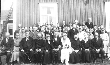 Kuva otettu Eemelin talon seinustalla. Vas eturivissä Juho Vepsä, Mari Vepsä (os. Henttonen), pappi Lappalainen, Tuomas Henttonen, Katri Henttonen, hääpari, Riitta Nenonen, morsiamen äiti, Josefiina Nenonen ja hänen miehensä Onni Nenonen (morsiamen veli). Morsiusparin takana keskellä seisoo sulhasen toinen Anna-Liisa Henttonen.